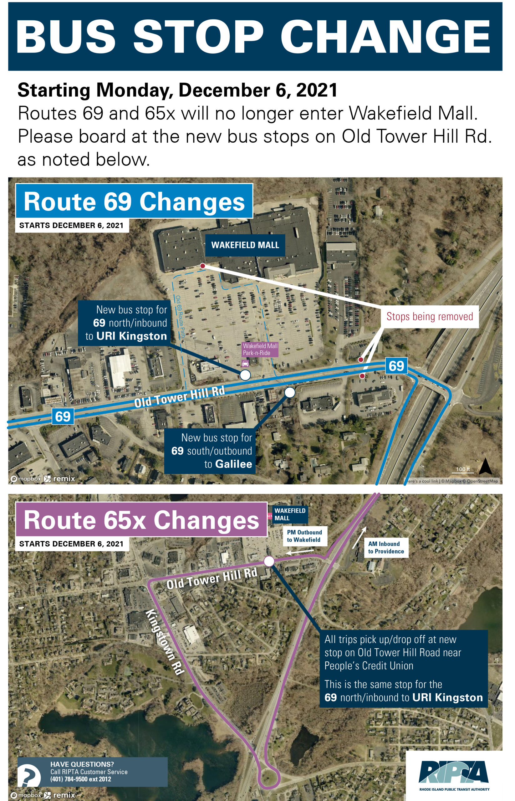 Route 69 passengers traveling northbound should board at the new bus stop located on the north side of Old Tower Hill Road just west of the main entrance to the Wakefield Mall.