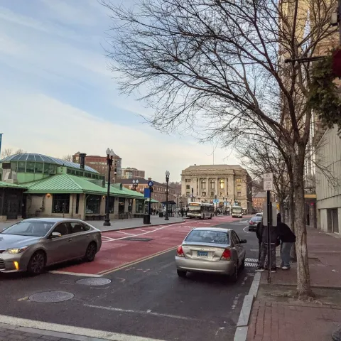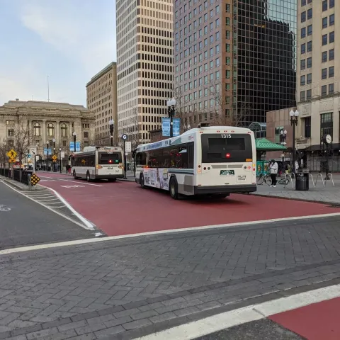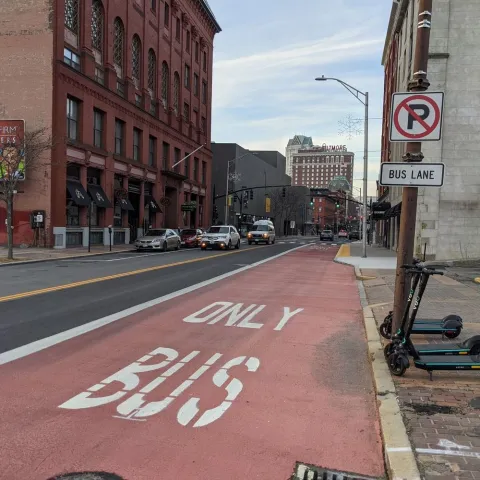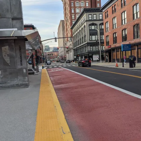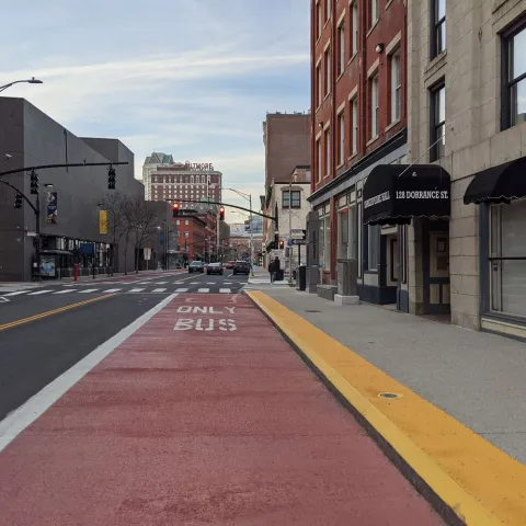 Dedicated bus lanes are located: along Eddy Street (north of RI Hospital) and near South Street Landing; on Dyer Street (in the southbound direction near the new Wexford development); and along Exchange Street (between Kennedy Plaza and Providence Station). Bus lanes are also located at all DTC stop locations, including the full northbound block of Dorrance Street between Friendship and Pine and the southbound block between Weybosset and Pine.